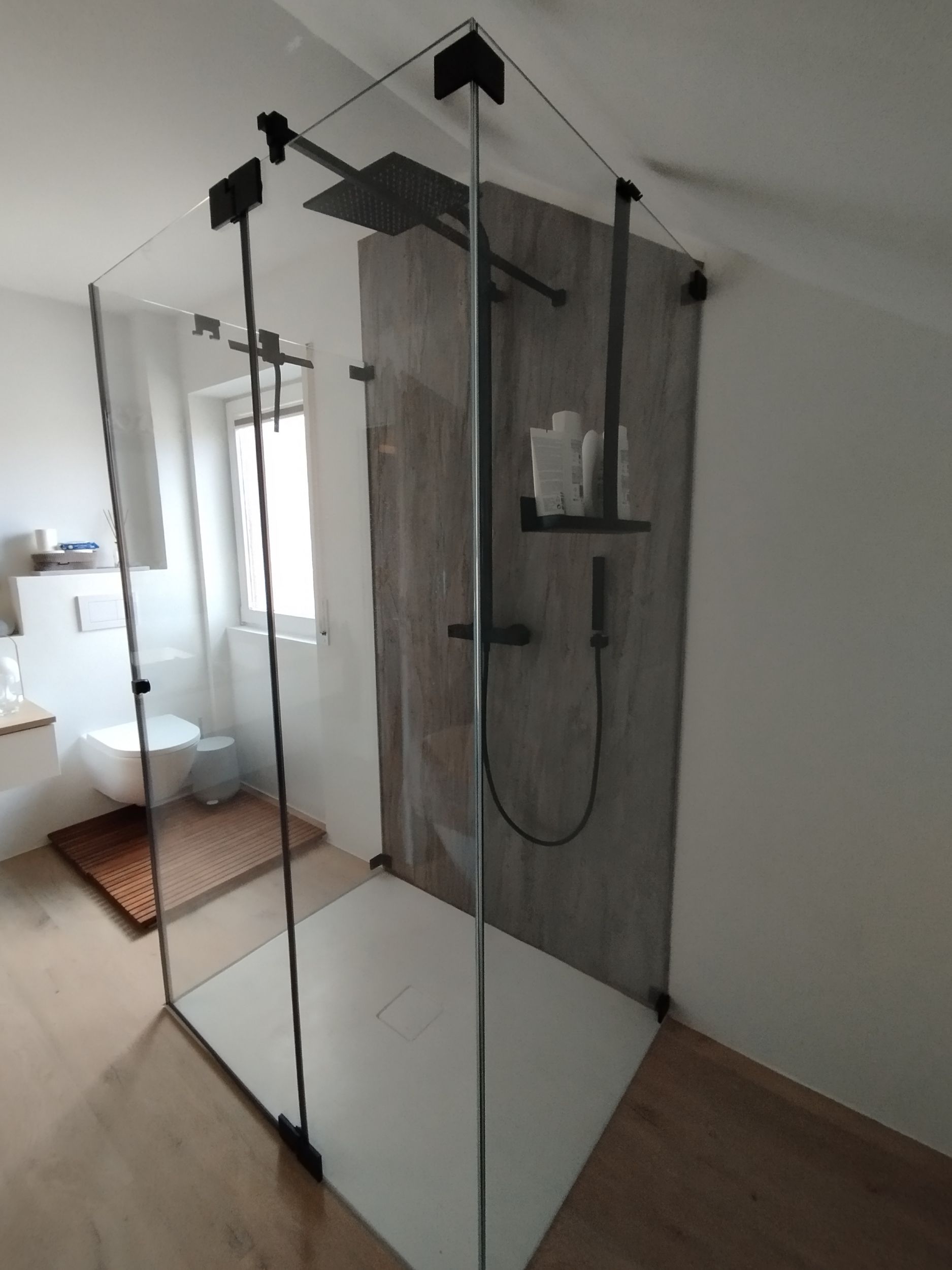 Duschabtrennungen werden auf Maß angefertigt, auch als Sonderlösungen. Sie bestehen aus Sicherheitsglas mit meist flächenbündigen Beschlägen, so dass sie leicht zu reinigen sind.